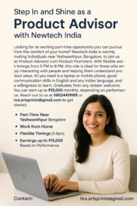 Newtech India welcomes you to apply for our part-time Product Advisor cum Product Promoter role. Based near Yeshwanthpur, Bangalore? You’re eligible. All we ask is that you bring your enthusiasm, a mobile or laptop, and fluency in Konkani and English language.