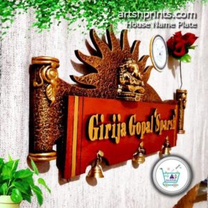 Bring divine charm and artistic elegance to your entrance with the “Girija Gopal Sparsh” premium designer wooden name plate, beautifully handcrafted by artsnprints.com.